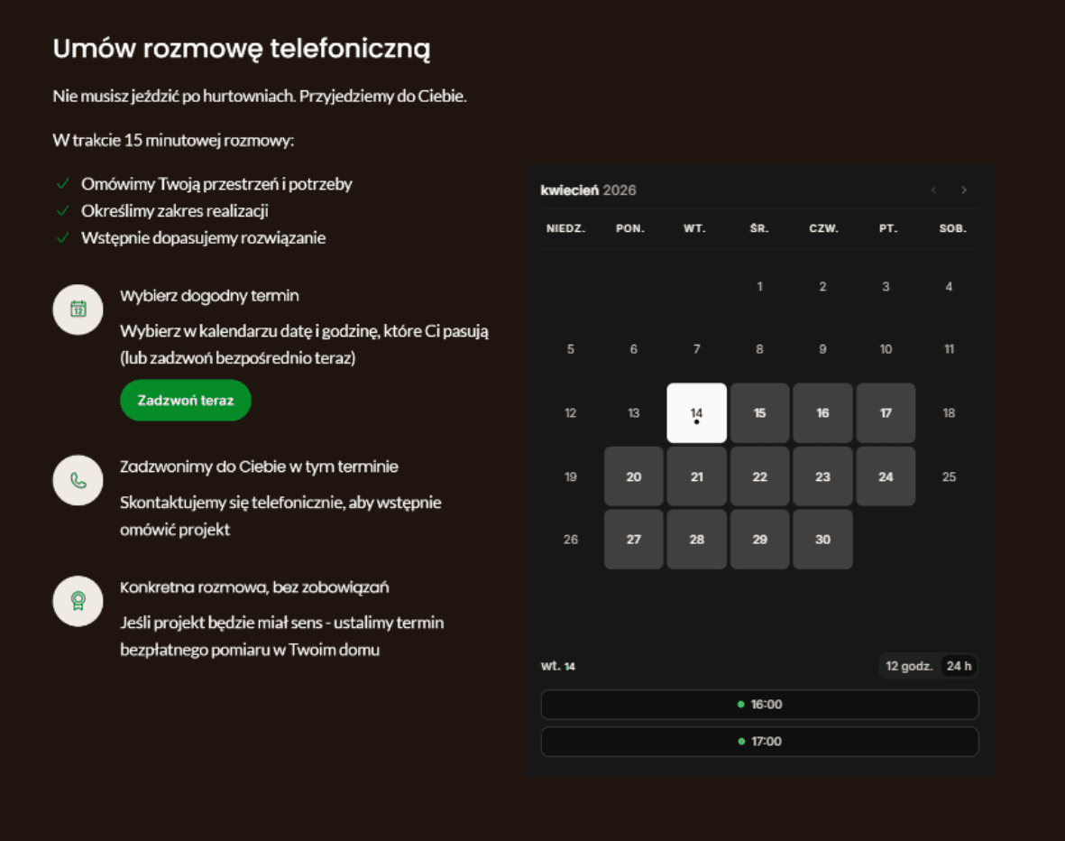 Zintegrowaliśmy kalendarz bezpośrednio na stronie. Klient umawia się sam, dostaje maile przypominające o spotkaniu, które wpada mu do kalendarza. W ten sposób nie marnujemy czasu na kontakt i nie tracimy zapytań.