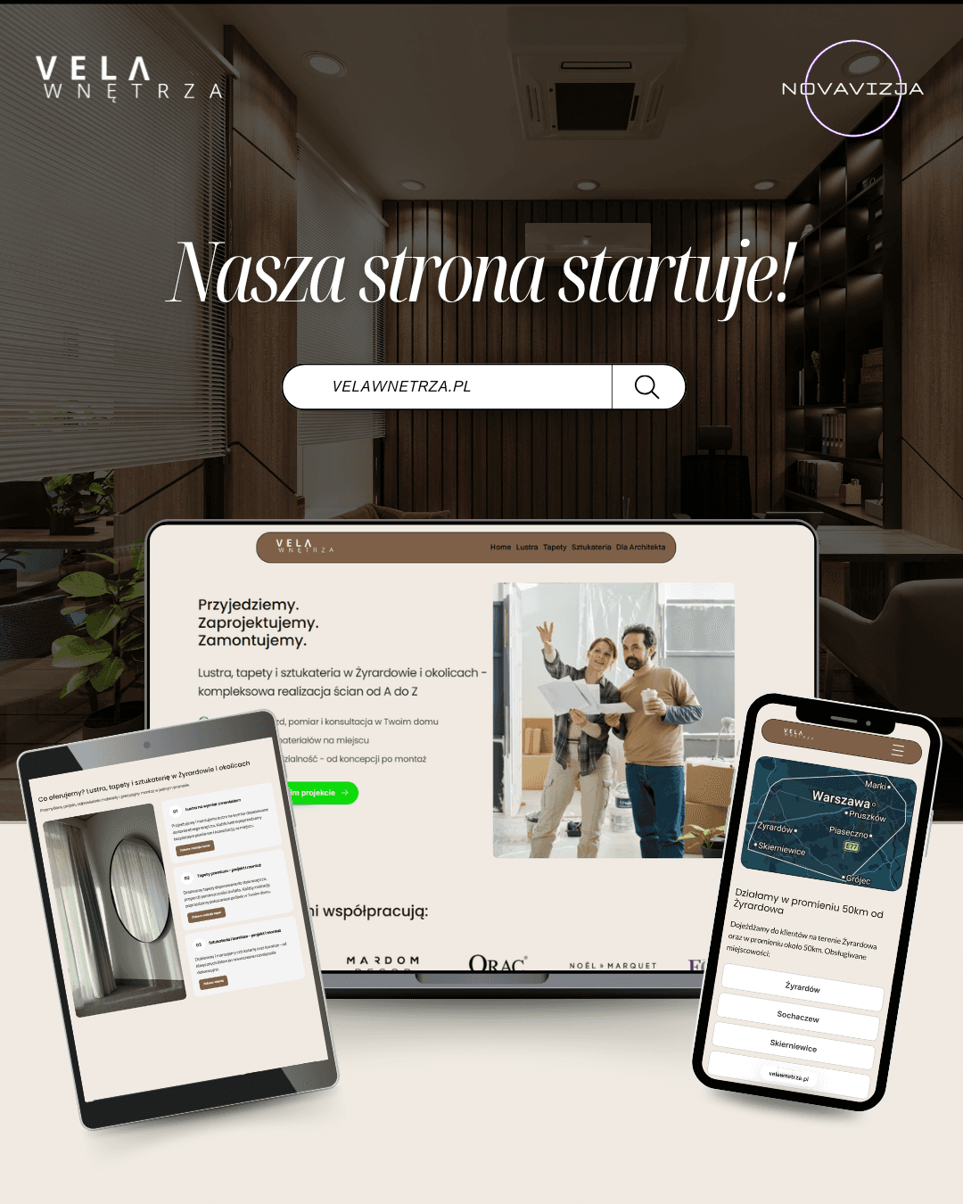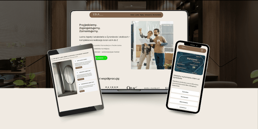 Vela Wnętrza to studio z Żyrardowa specjalizujące się w projektowaniu i wykończeniach ścian - lustrach, tapetach i sztukaterii. Świetna oferta, ale dopiero startująca firma bez żadnej obecności online. Zero strony, zero wizytówki Google, zerowa widoczność lokalna w Żyrardowie. Firma nie pozyskiwała żadnych klientów przez internet.