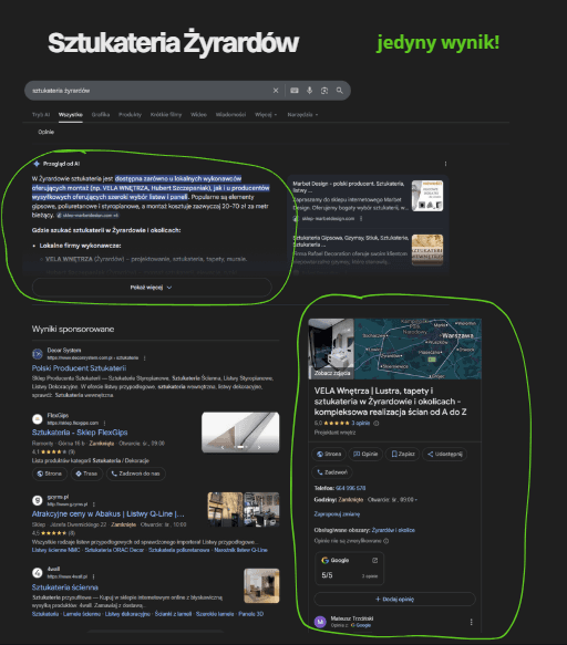 Przy wyszukaniu frazy "sztukateria Żyrardów" - Vela wnętrza to jedyny lokalny wynik w Google. Dodatkowo Google AI już wymienia Vela z nazwy w odpowiedziach.