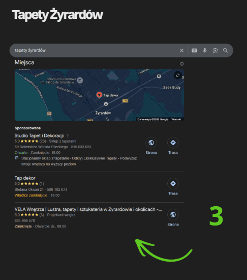 Zbudowaliśmy wizytówkę Google pod te same lokalne frazy. Zadbaliśmy o to żeby studio było widoczne na mapach dla klientów z okolicy.