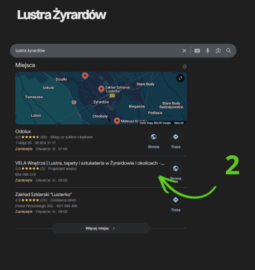 Przy wyszukaniu frazy "lustra Żyrardów" - Vela wnętrza wyświetla się jako drugi wynik.