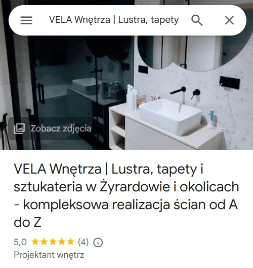Przy wyszukaniu frazy "tapety Żyrardów" - Vela wnętrza wyświetla się jako trzeci wynik.