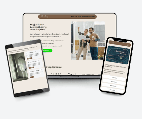 Strona powstała z myślą o zakomunikowaniu tej przewagi oraz konkretnych frazach które klient wyszuka w Google. Postawiliśmy na "tapety Żyrardów", "lustra Żyrardów" i "sztukateria Żyrardów". To nie tylko ładny design ale narzędzie które pracuje na pozyskiwanie zapytań.