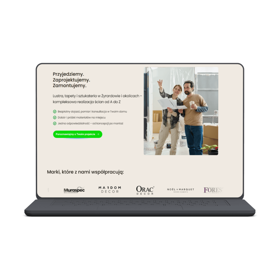 System online zbudowany od zera dla studia projektowego które wyróżnia się na rynku unikalnym modelem – oprócz projektowania dostarcza i montuje własne tapety, lustra i sztukaterie. Jeden zespół, jedna odpowiedzialność od koncepcji po finalny efekt. Efekt: TOP 3 w lokalnych wyszukiwaniach w Żyrardowie po 14 dniach od startu, 6 telefonów z wizytówki w pierwszym tygodniu.